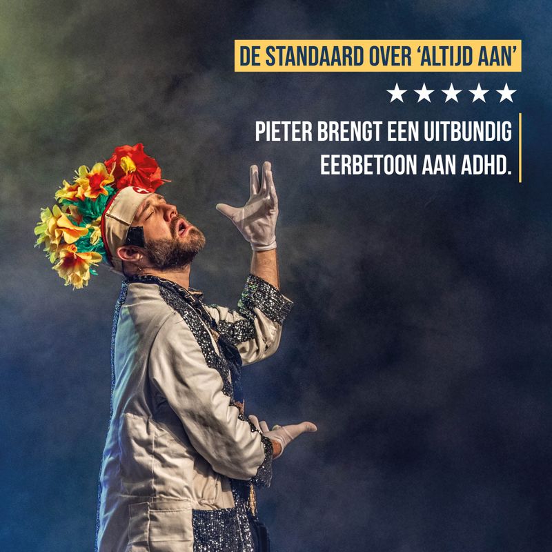 In zijn nieuwe comedyvoorstelling geeft Pieter Verelst een eerlijke inkijk in wat er werkelijk allemaal gaande is in dat absurde hoofd van hem. Altijd Aan is een herkenbare voorstelling over graag willen leven, alles willen meemaken en er willen zijn voor anderen, maar toch net iets te weinig voor jezelf.
